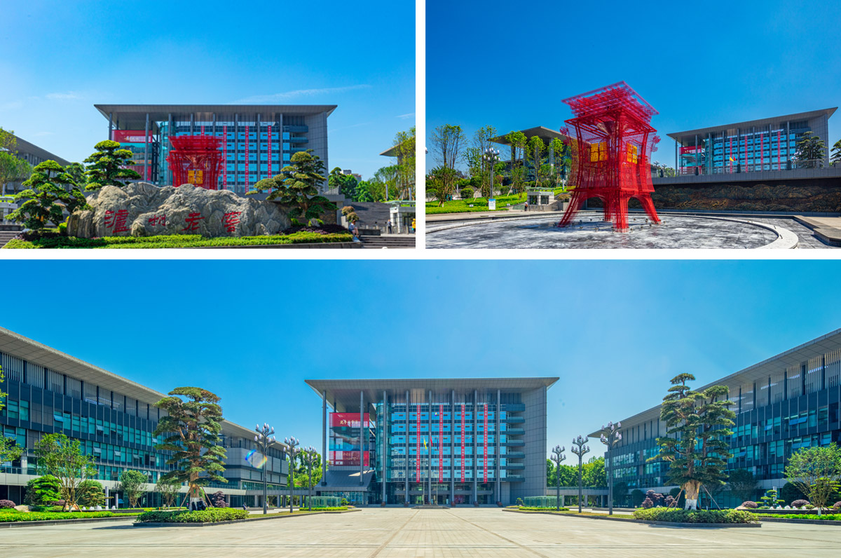 瀘州老窖廣場(chǎng)分上下兩層,上廣場(chǎng)為瀘州老窖營(yíng)銷指揮中心辦公大樓,其中主樓似酒樽,東?樓似酒爵,取“雙爵捧樽”之意。